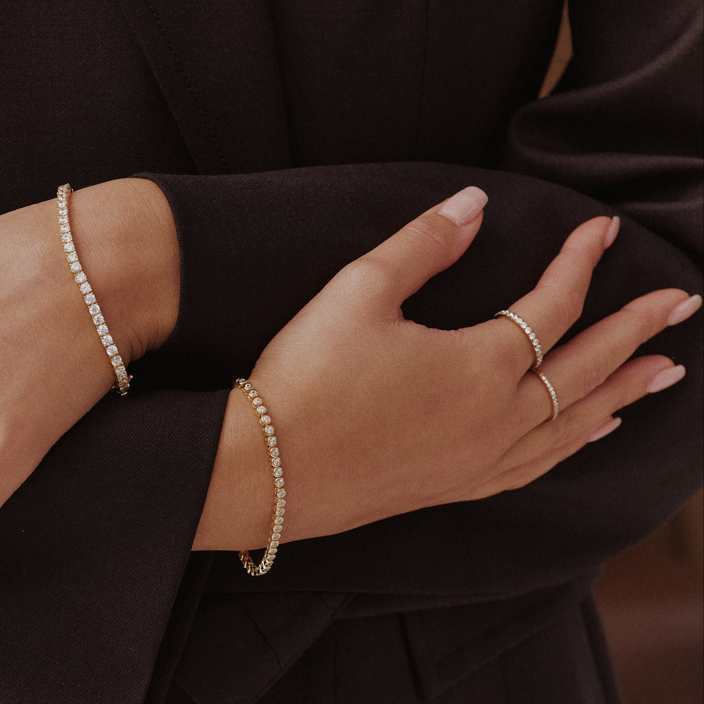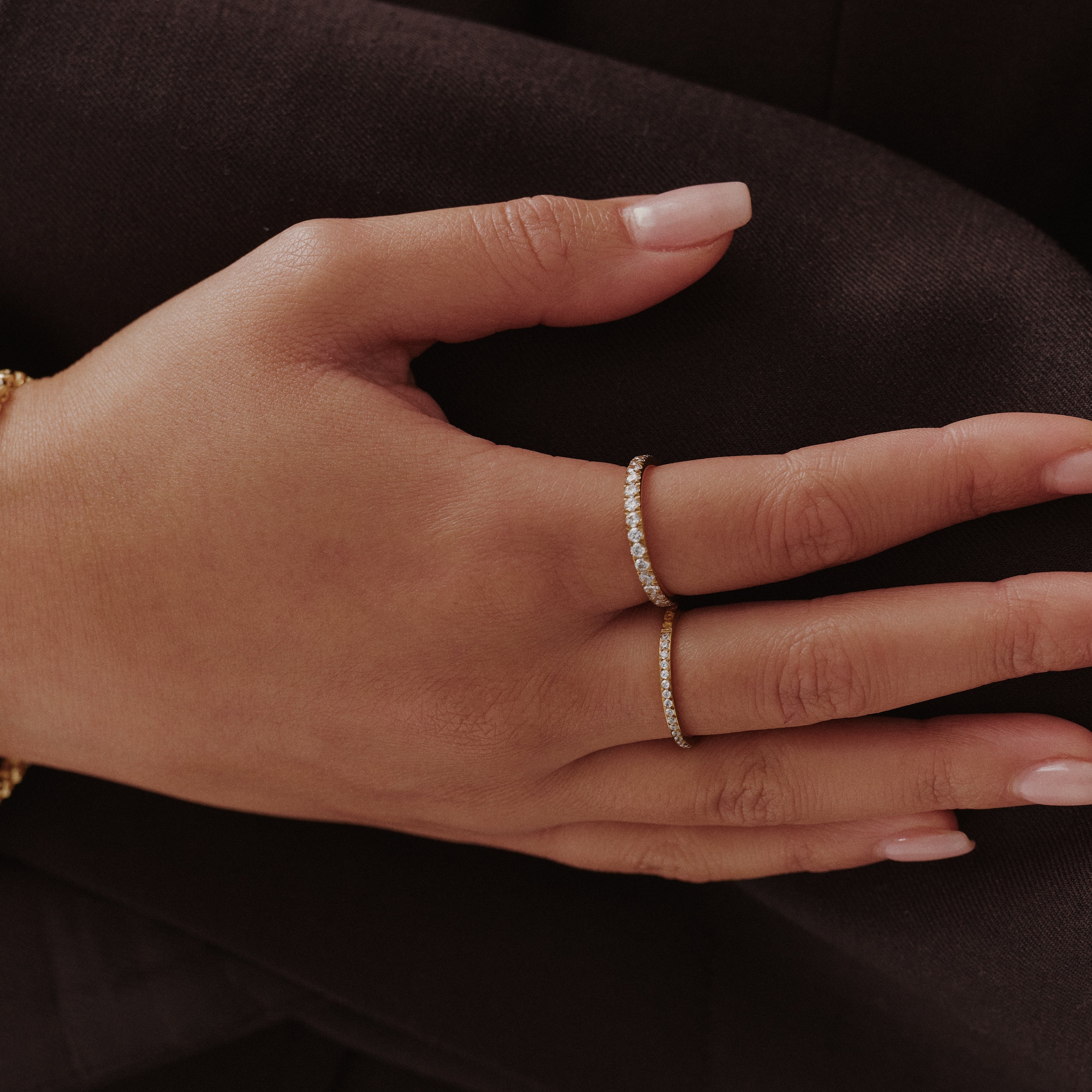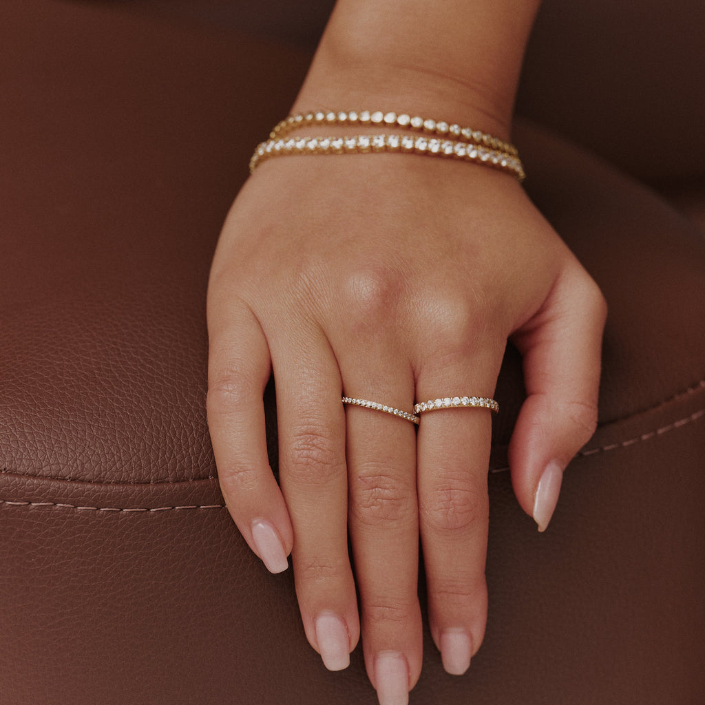 The Full Aura Ring features a line of tiny pavé stones that catch the light from every angle. It’s the perfect everyday sparkle, simple enough to wear with everything, but special enough to stand out. Waterproof, tarnish-proof, and made to last.