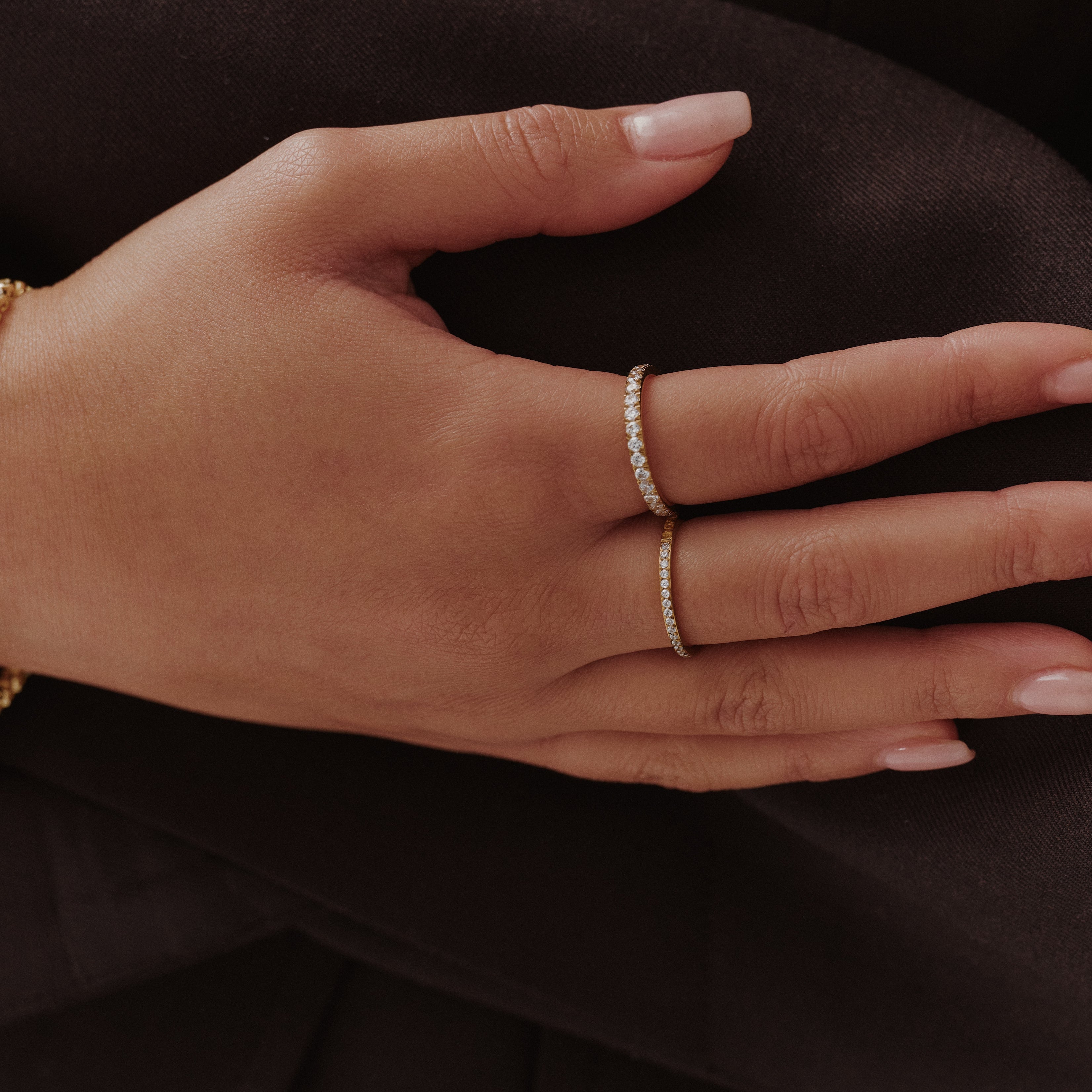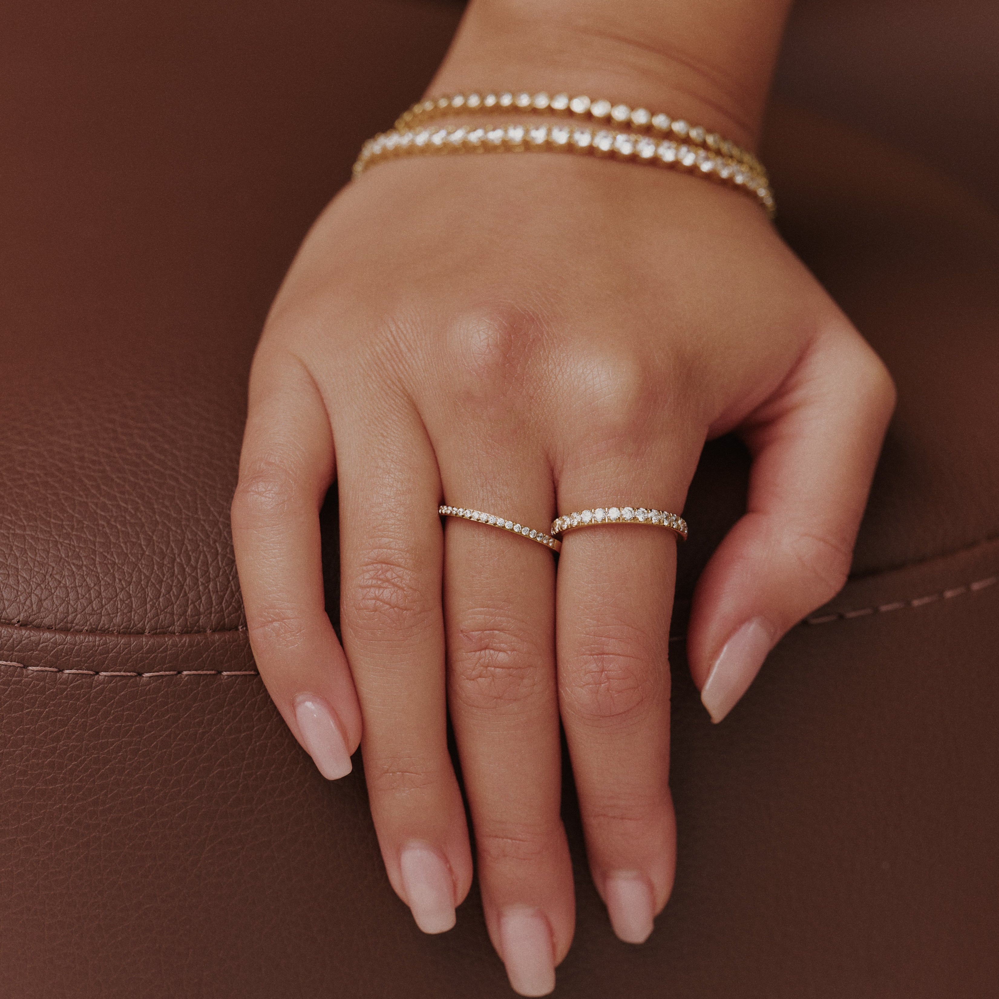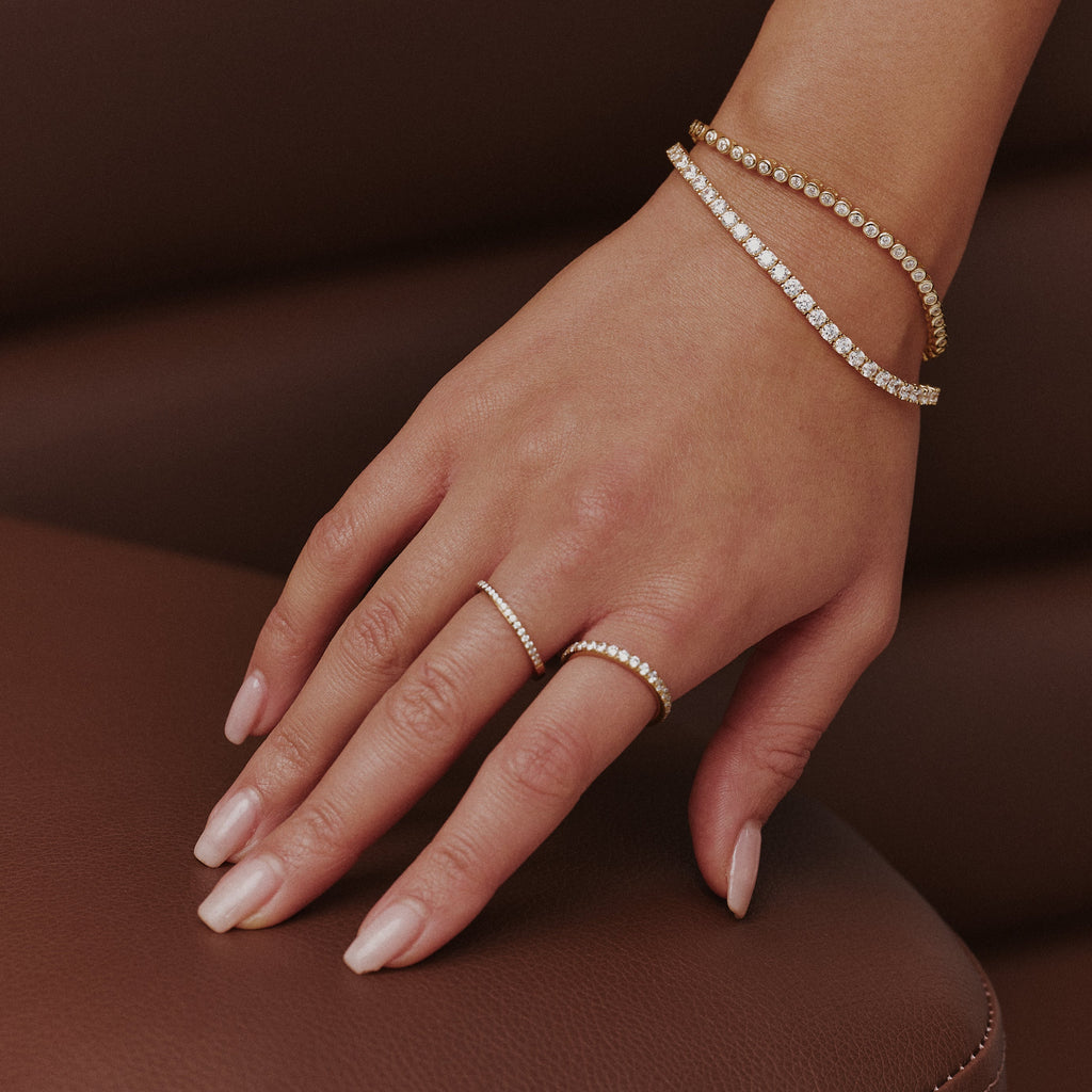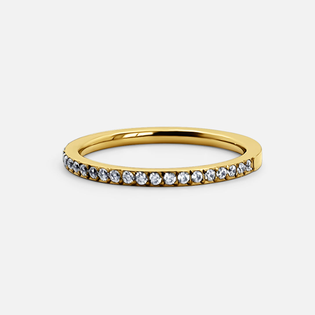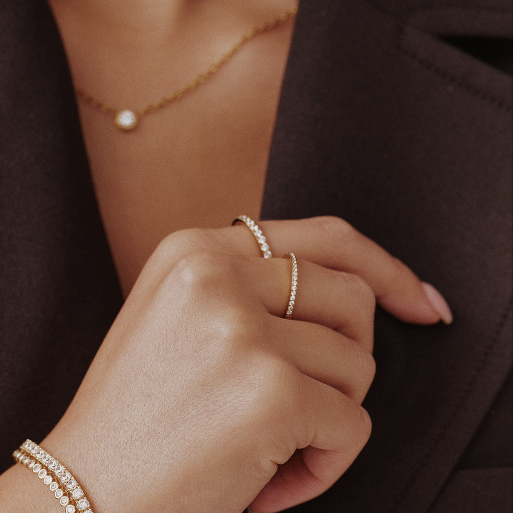 The Half Aura Ring is the piece you’ll reach for again and again, a delicate row of pavé stones set against a smooth gold band. Easy to wear and perfect for stacking. Waterproof, tarnish-proof, and made for every moment.