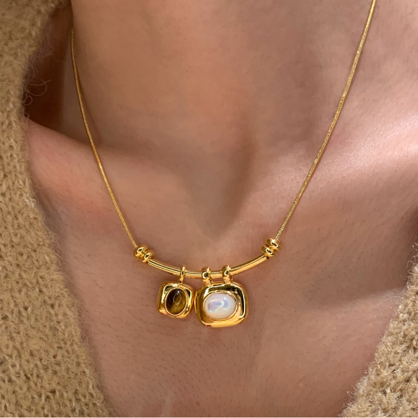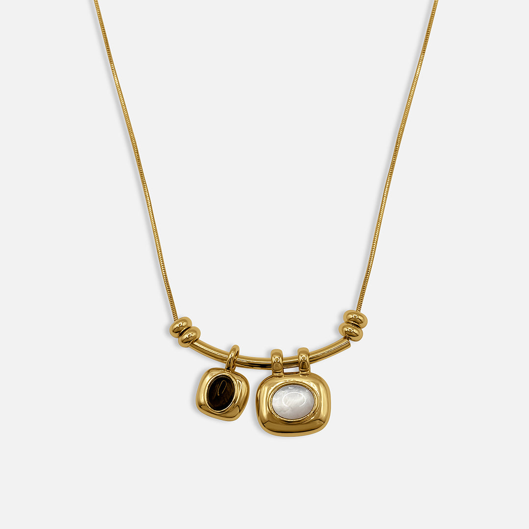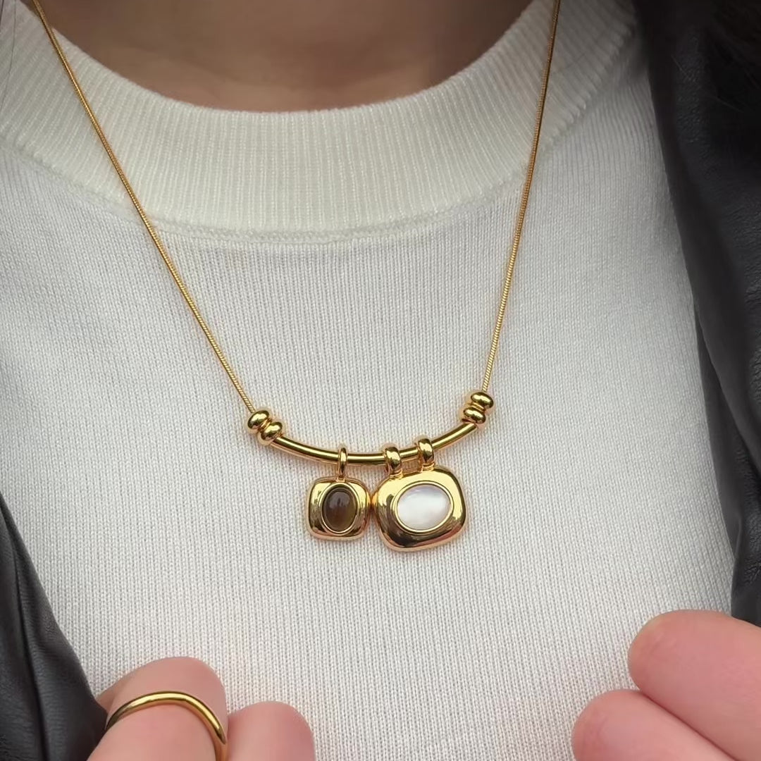 A refined double gemstone necklace featuring a warm brown stone and a soft pearly white pendant. Balanced, understated and easy to wear with open necklines, tailoring or simple tees.