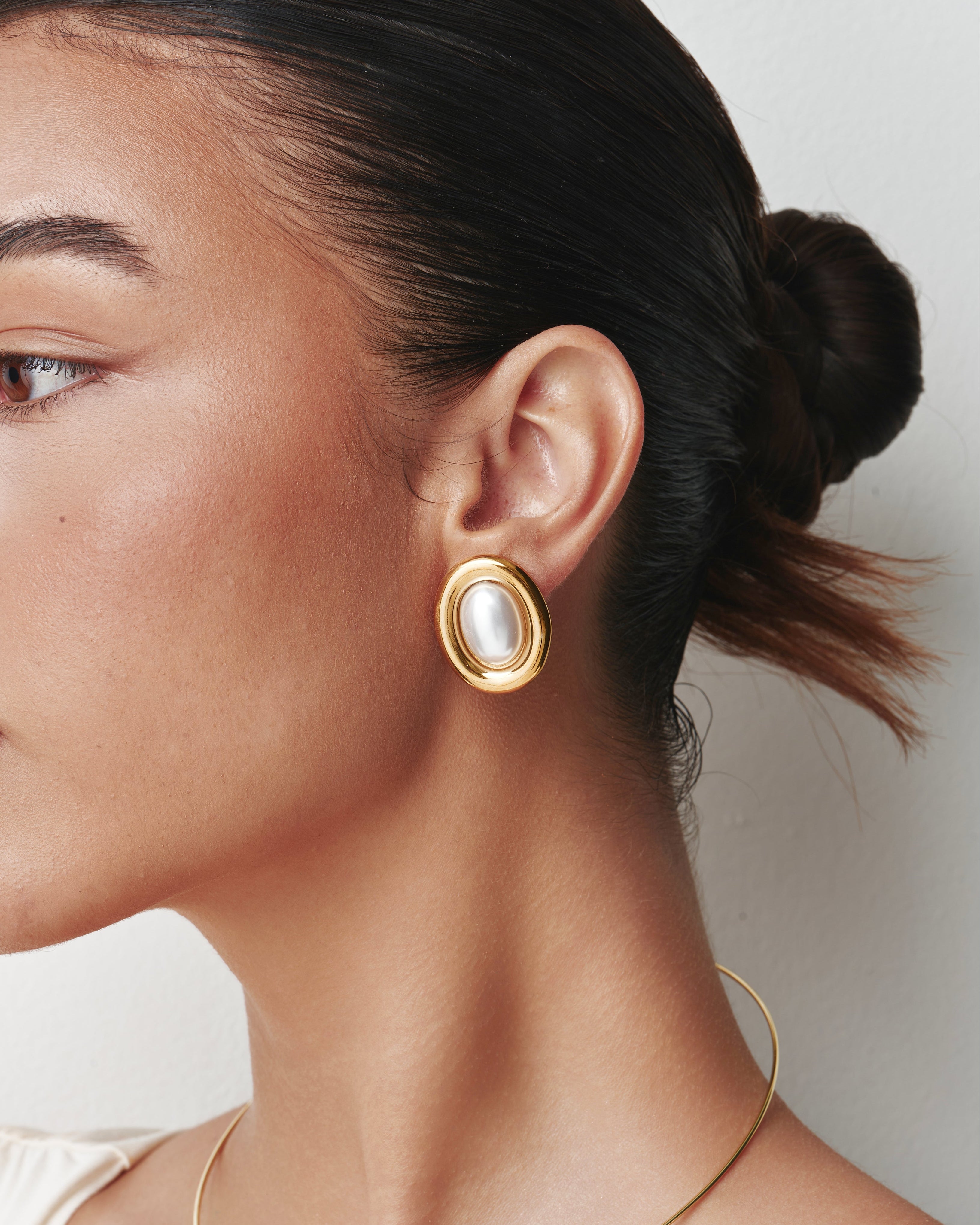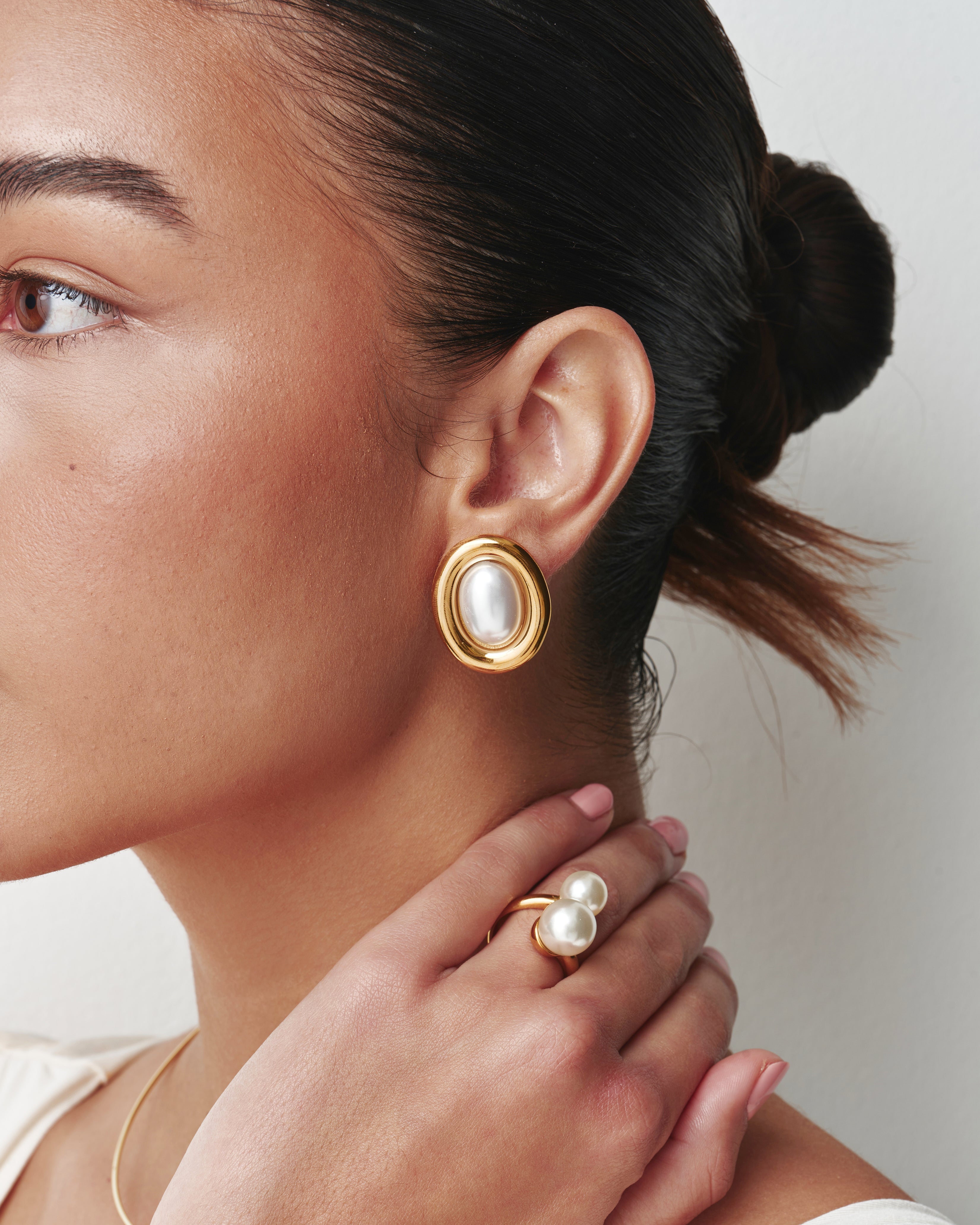 A soft oval pearl set within a sculpted gold frame.