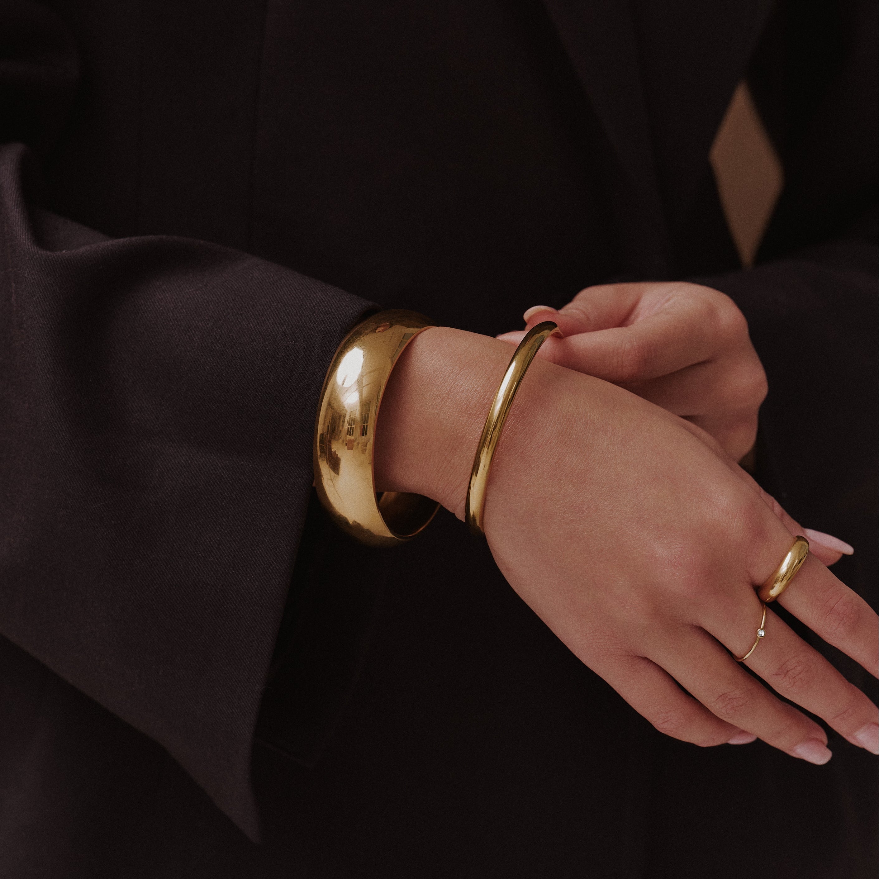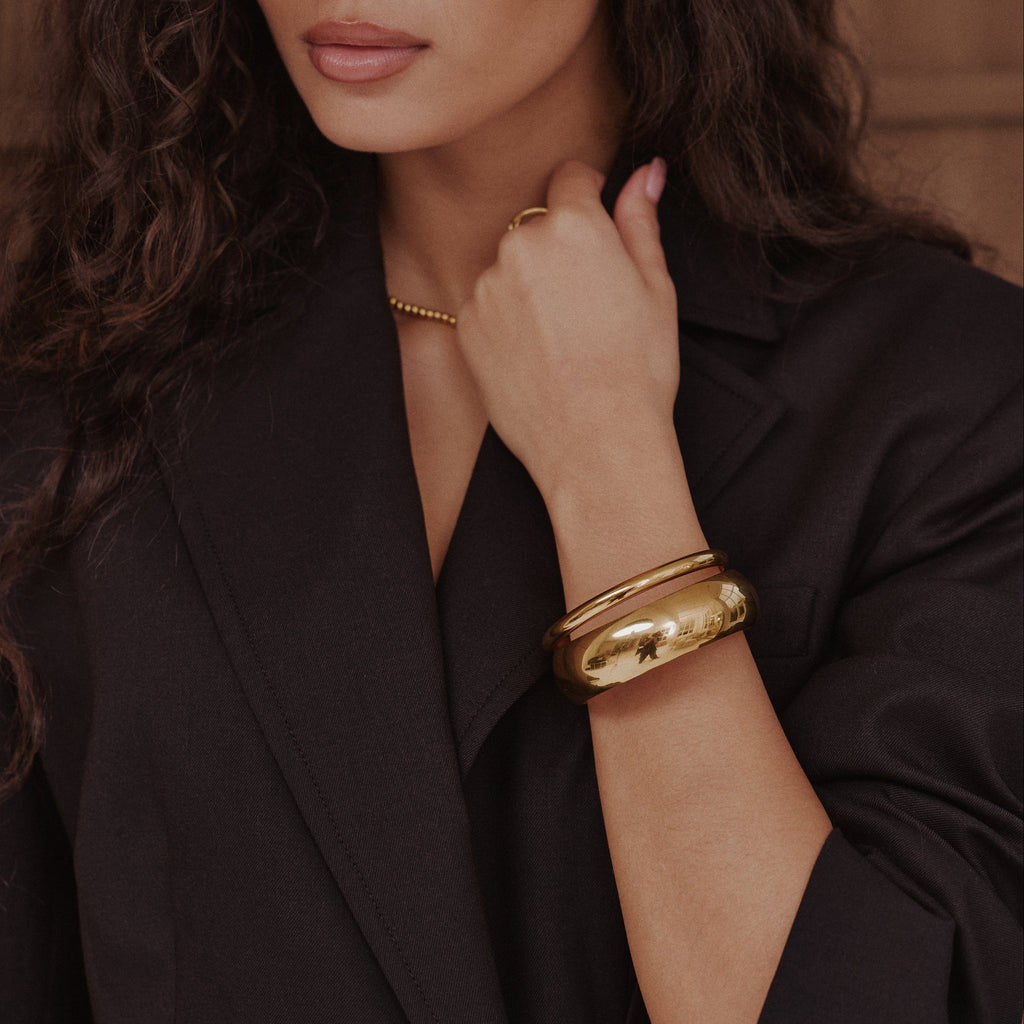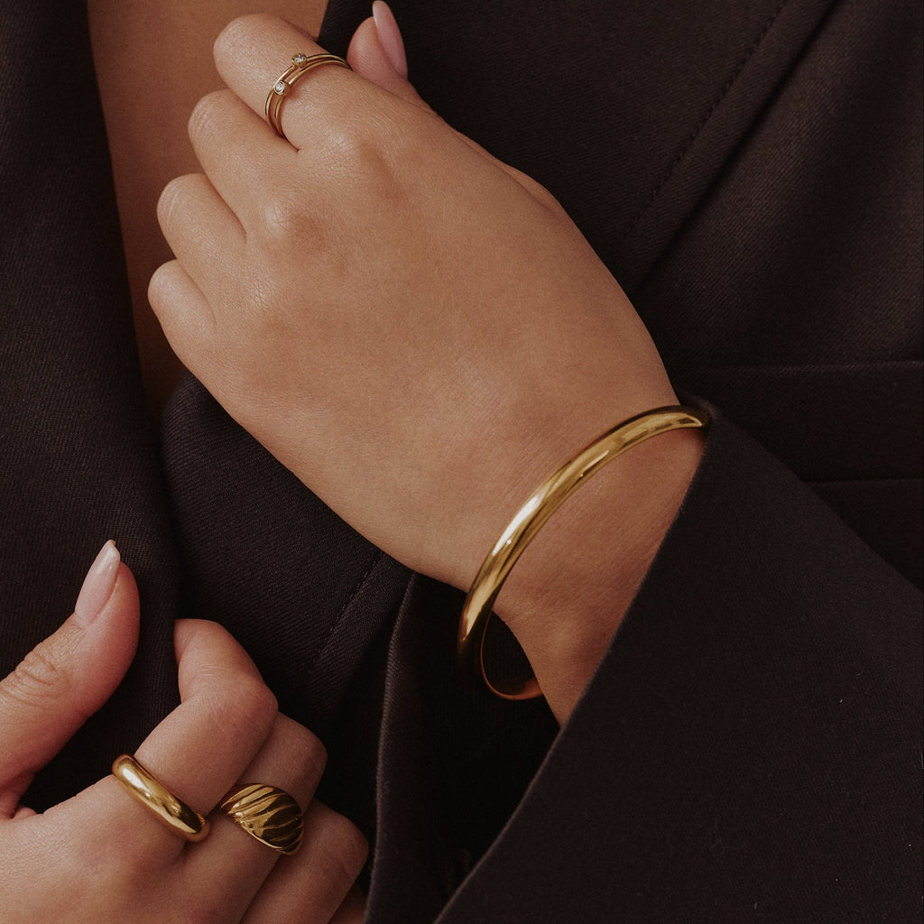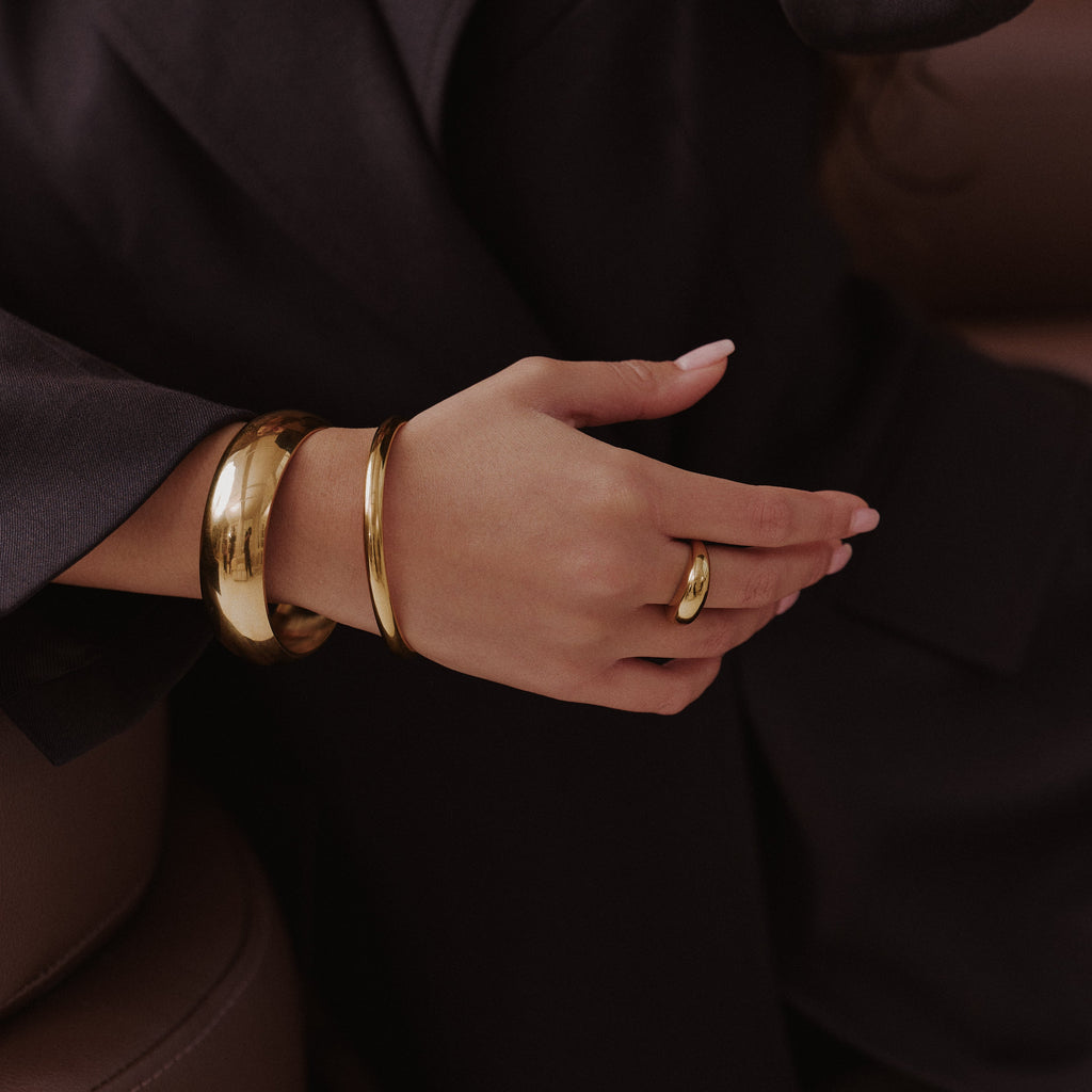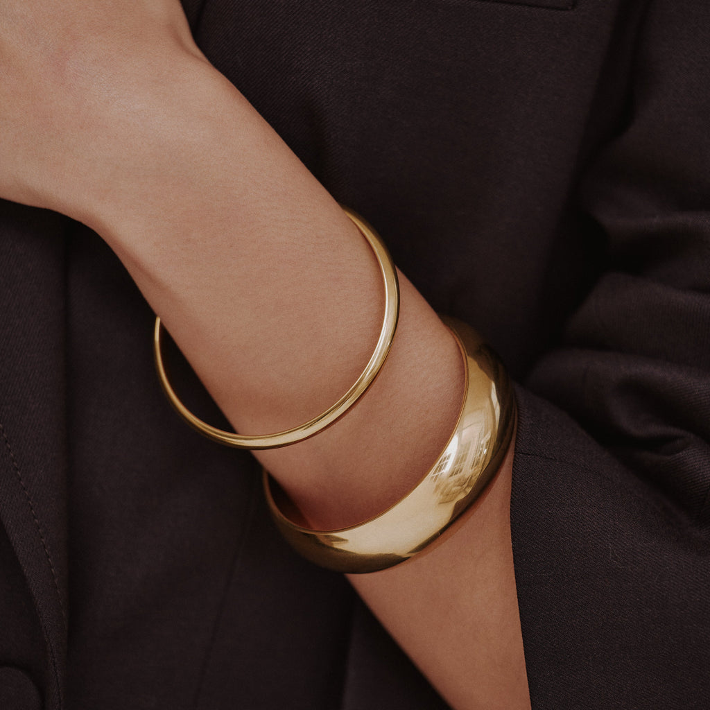 The Signature Slim Bangle is a lighter take on our classic silhouette, polished, minimal, and designed to move effortlessly from day to night. Crafted from waterproof, tarnish-proof materials, it’s made for everyday wear, to be layered, stacked, or worn solo for a subtle statement.